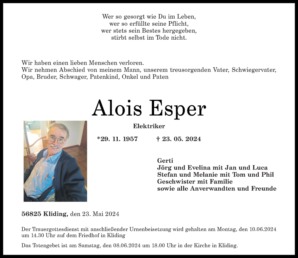 Hier finden Sie alle Traueranzeigen aus der Zeitung, die bisher für Alois Esper erschienen sind. Weitere Traueranzeigen, die in der Zeitung erscheinen, werden hier ebenfalls aufgelistet