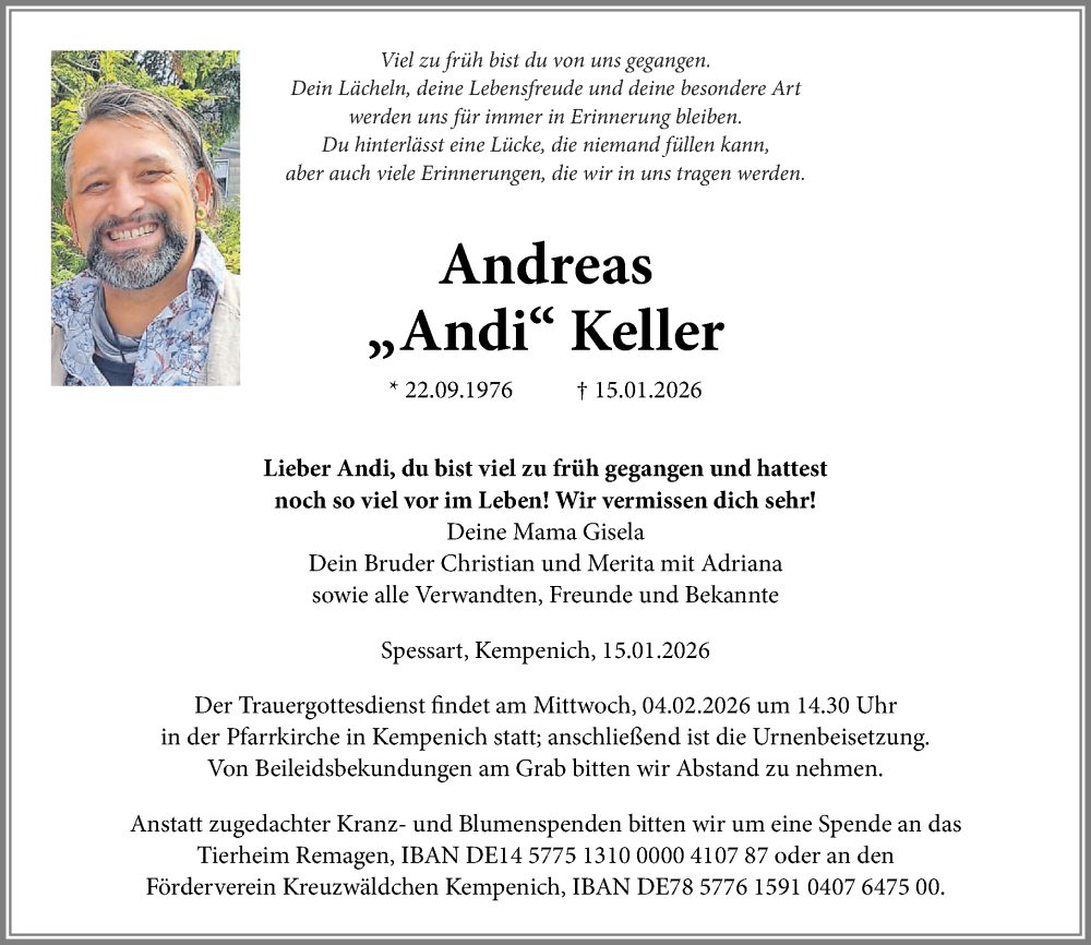 Hier finden Sie alle Traueranzeigen aus der Zeitung, die bisher für Andreas Keller erschienen sind. Weitere Traueranzeigen, die in der Zeitung erscheinen, werden hier ebenfalls aufgelistet