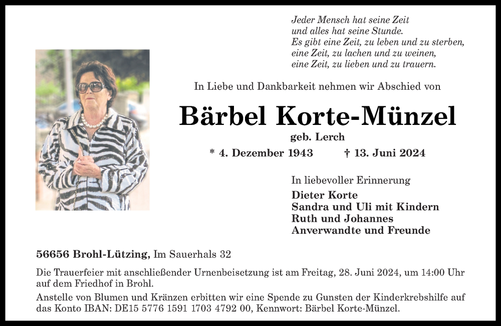 Hier finden Sie alle Traueranzeigen aus der Zeitung, die bisher für Bärbel Korte-Münzel erschienen sind. Weitere Traueranzeigen, die in der Zeitung erscheinen, werden hier ebenfalls aufgelistet