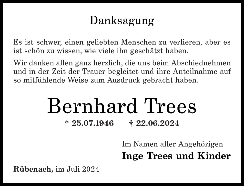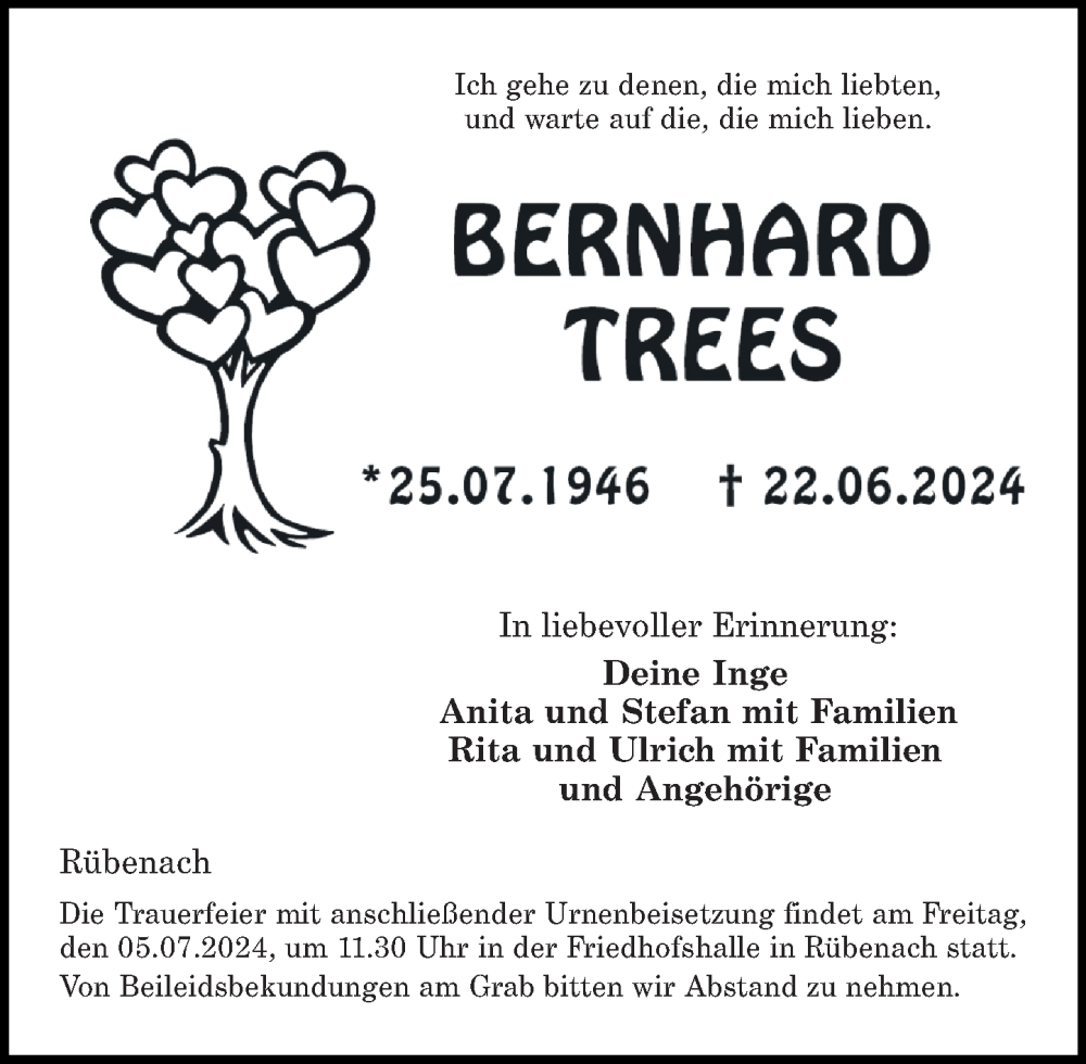 Hier finden Sie alle Traueranzeigen aus der Zeitung, die bisher für Bernhard Trees erschienen sind. Weitere Traueranzeigen, die in der Zeitung erscheinen, werden hier ebenfalls aufgelistet