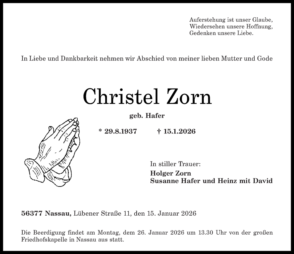 Hier finden Sie alle Traueranzeigen aus der Zeitung, die bisher für Christel Zorn erschienen sind. Weitere Traueranzeigen, die in der Zeitung erscheinen, werden hier ebenfalls aufgelistet