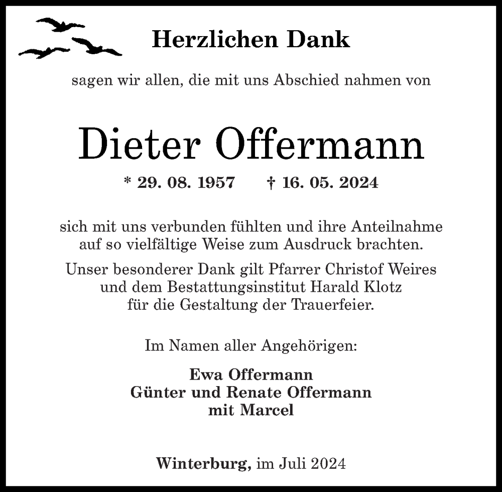 Hier finden Sie alle Traueranzeigen aus der Zeitung, die bisher für Dieter Offermann erschienen sind. Weitere Traueranzeigen, die in der Zeitung erscheinen, werden hier ebenfalls aufgelistet