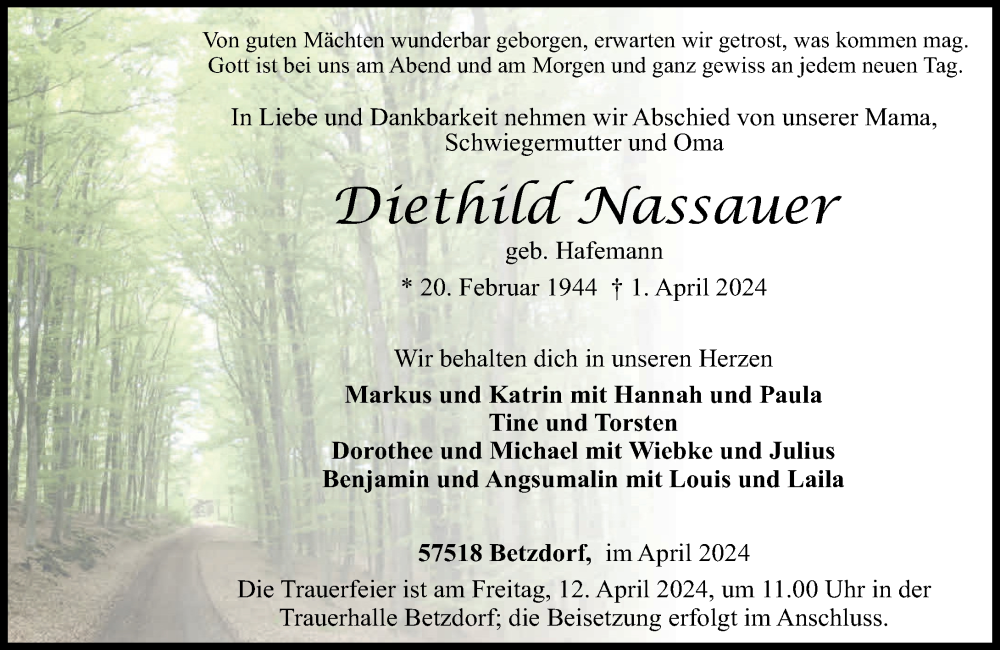 Hier finden Sie alle Traueranzeigen aus der Zeitung, die bisher für Diethild Nassauer erschienen sind. Weitere Traueranzeigen, die in der Zeitung erscheinen, werden hier ebenfalls aufgelistet