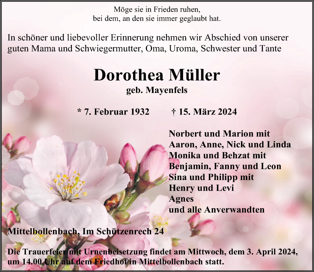 Hier finden Sie alle Traueranzeigen aus der Zeitung, die bisher für Dorothea Müller erschienen sind. Weitere Traueranzeigen, die in der Zeitung erscheinen, werden hier ebenfalls aufgelistet