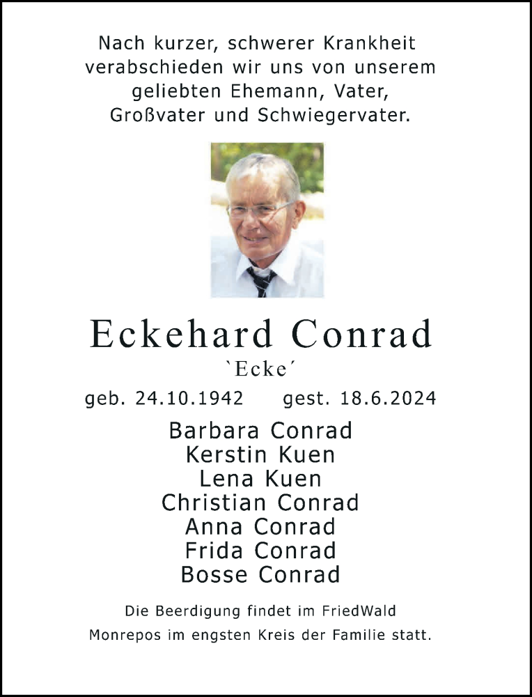 Hier finden Sie alle Traueranzeigen aus der Zeitung, die bisher für Eckehard Conrad erschienen sind. Weitere Traueranzeigen, die in der Zeitung erscheinen, werden hier ebenfalls aufgelistet