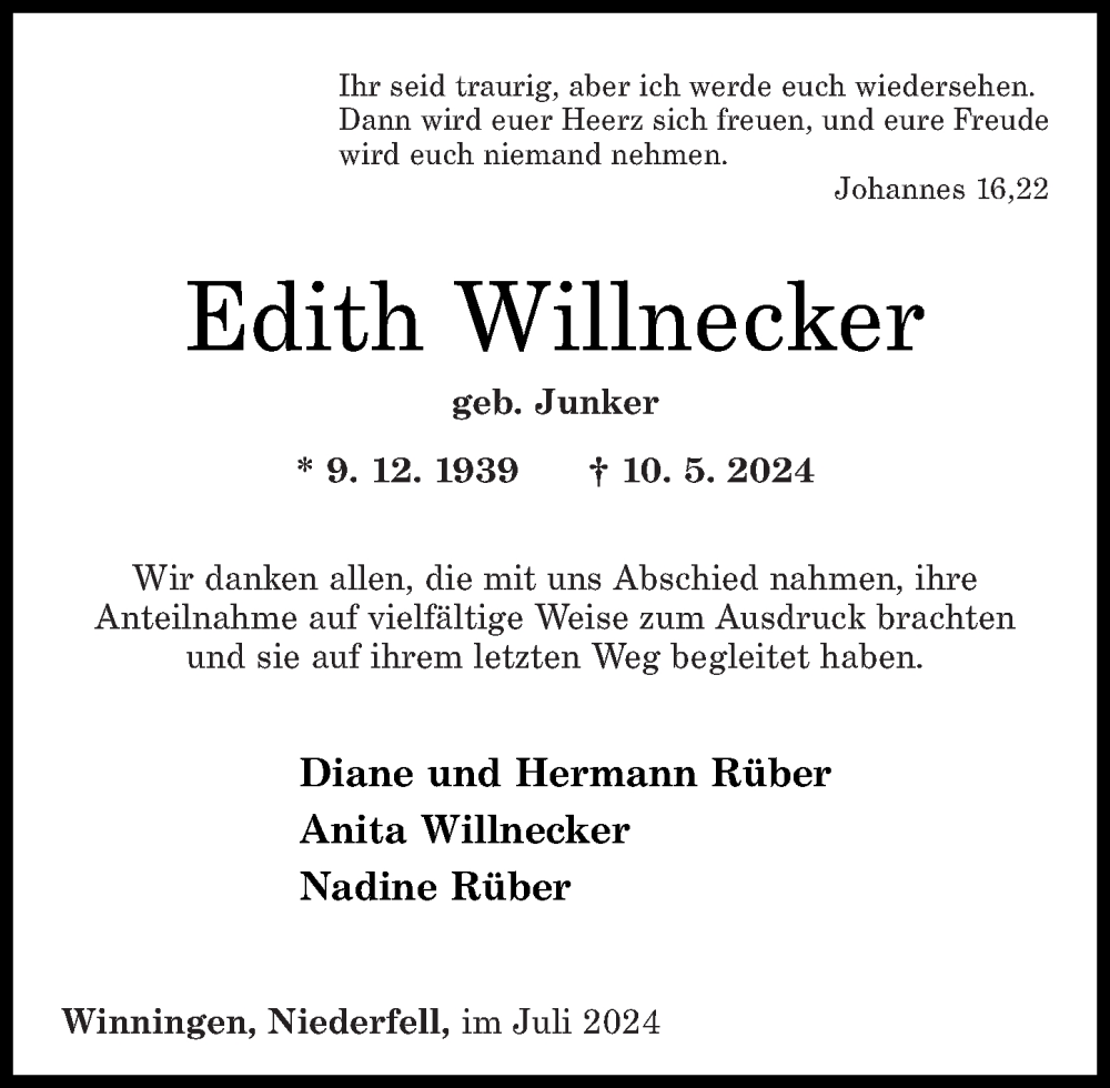 Hier finden Sie alle Traueranzeigen aus der Zeitung, die bisher für Edith Willnecker erschienen sind. Weitere Traueranzeigen, die in der Zeitung erscheinen, werden hier ebenfalls aufgelistet