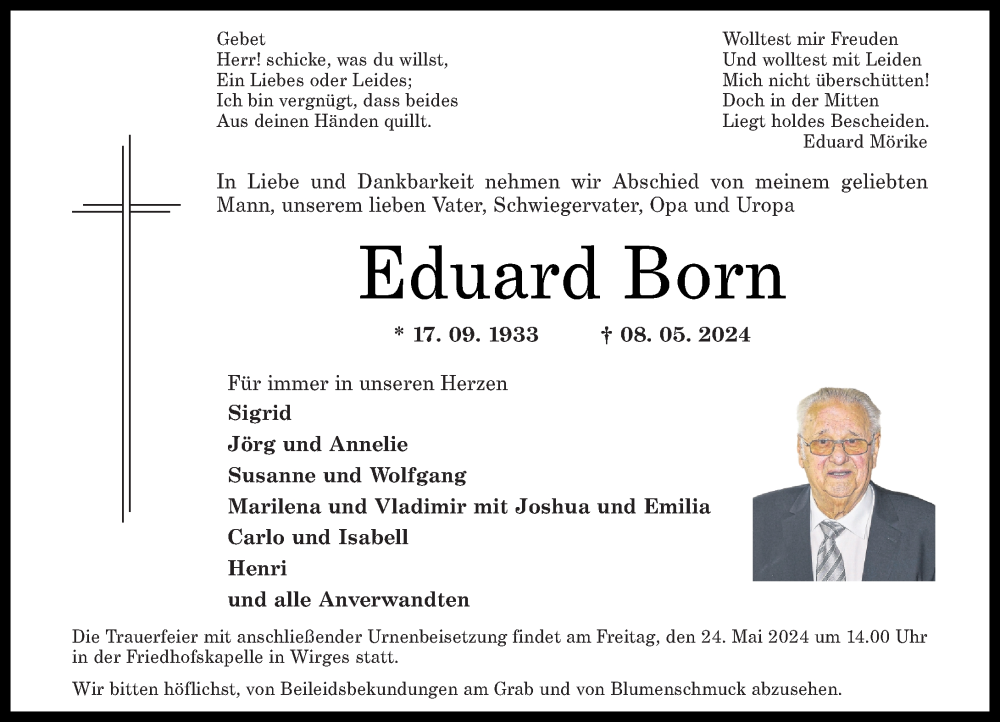 Hier finden Sie alle Traueranzeigen aus der Zeitung, die bisher für Eduard Born erschienen sind. Weitere Traueranzeigen, die in der Zeitung erscheinen, werden hier ebenfalls aufgelistet