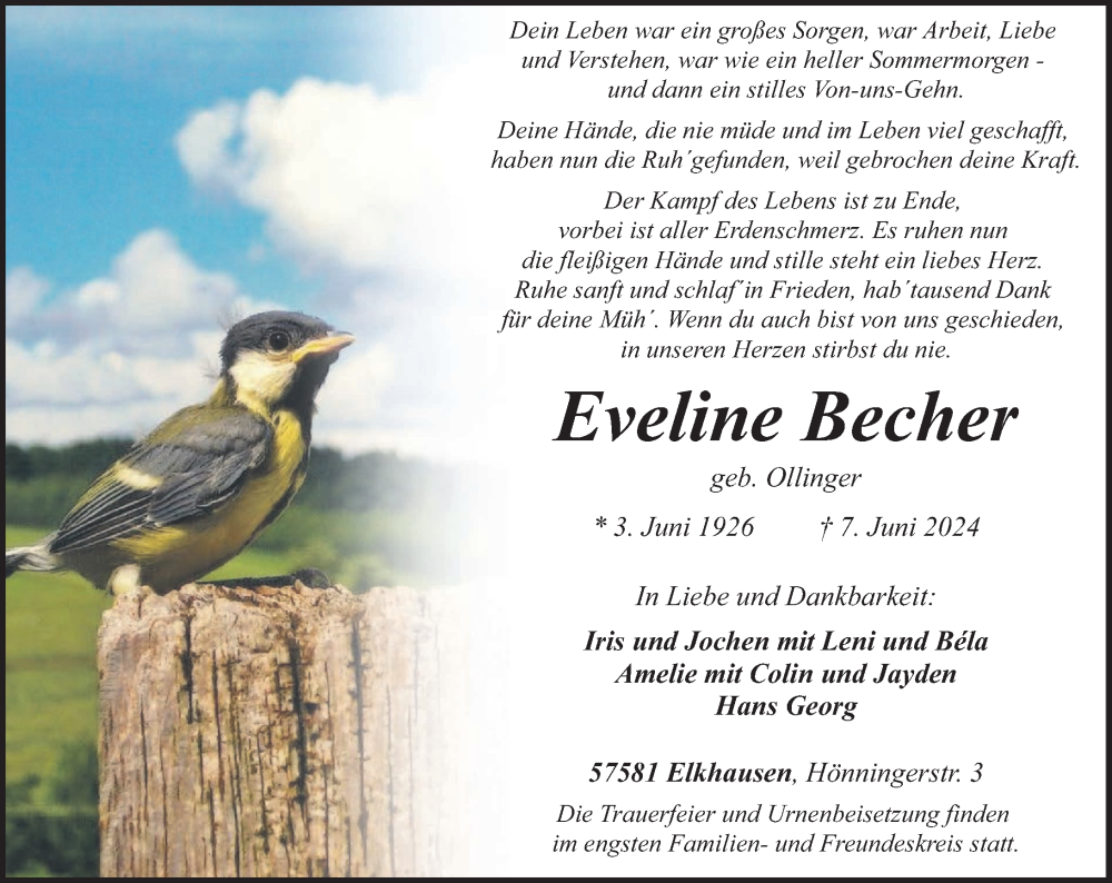 Hier finden Sie alle Traueranzeigen aus der Zeitung, die bisher für Eveline Becher erschienen sind. Weitere Traueranzeigen, die in der Zeitung erscheinen, werden hier ebenfalls aufgelistet