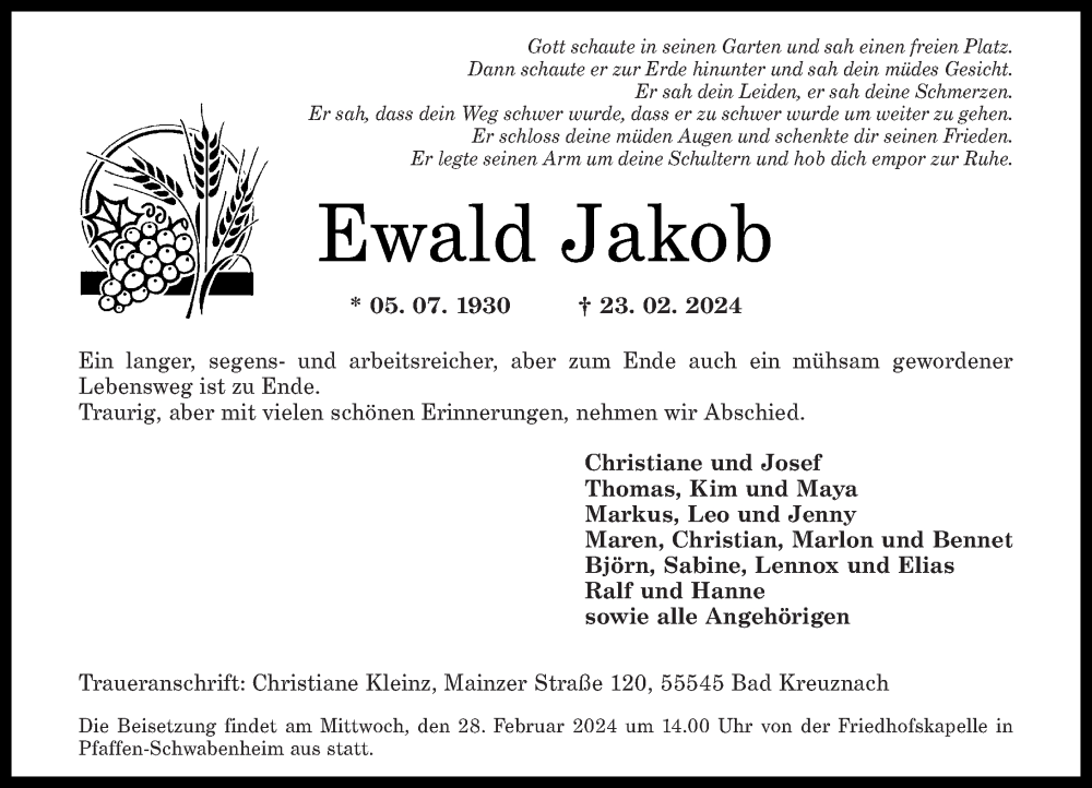 Hier finden Sie alle Traueranzeigen aus der Zeitung, die bisher für Ewald Jakob erschienen sind. Weitere Traueranzeigen, die in der Zeitung erscheinen, werden hier ebenfalls aufgelistet