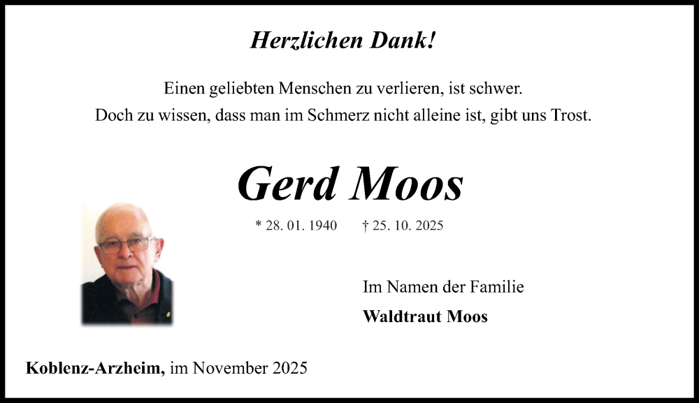 Hier finden Sie alle Traueranzeigen aus der Zeitung, die bisher für Gerd Moos erschienen sind. Weitere Traueranzeigen, die in der Zeitung erscheinen, werden hier ebenfalls aufgelistet