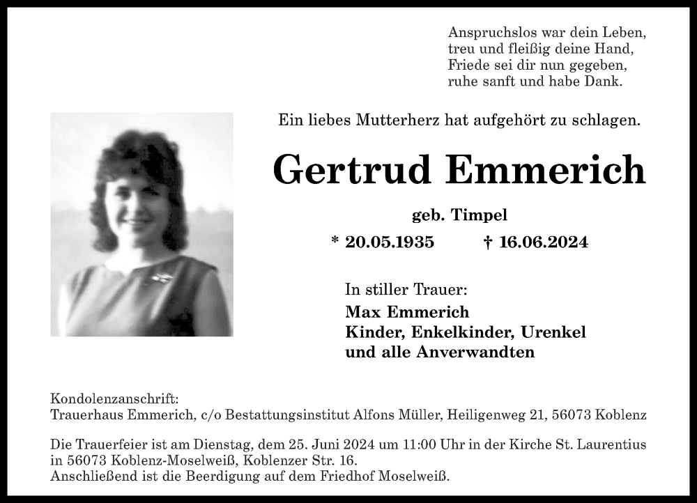 Hier finden Sie alle Traueranzeigen aus der Zeitung, die bisher für Gertrud Emmerich erschienen sind. Weitere Traueranzeigen, die in der Zeitung erscheinen, werden hier ebenfalls aufgelistet