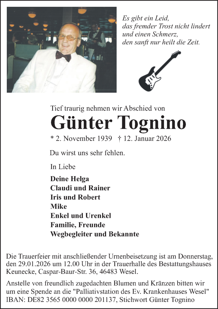 Hier finden Sie alle Traueranzeigen aus der Zeitung, die bisher für Günter Tognino erschienen sind. Weitere Traueranzeigen, die in der Zeitung erscheinen, werden hier ebenfalls aufgelistet