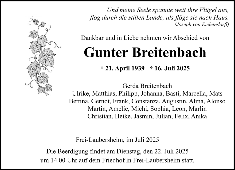 Hier finden Sie alle Traueranzeigen aus der Zeitung, die bisher für Gunter Breitenbach erschienen sind. Weitere Traueranzeigen, die in der Zeitung erscheinen, werden hier ebenfalls aufgelistet
