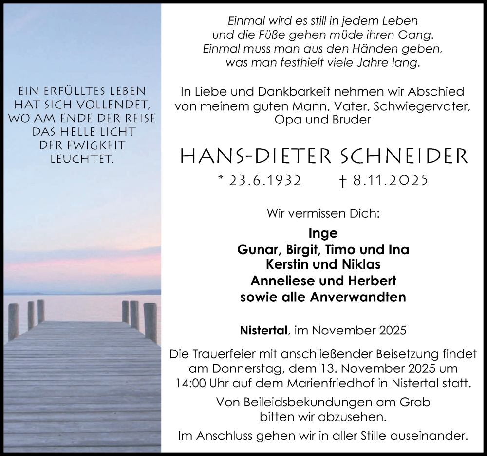 Hier finden Sie alle Traueranzeigen aus der Zeitung, die bisher für Hans-Dieter Schneider erschienen sind. Weitere Traueranzeigen, die in der Zeitung erscheinen, werden hier ebenfalls aufgelistet