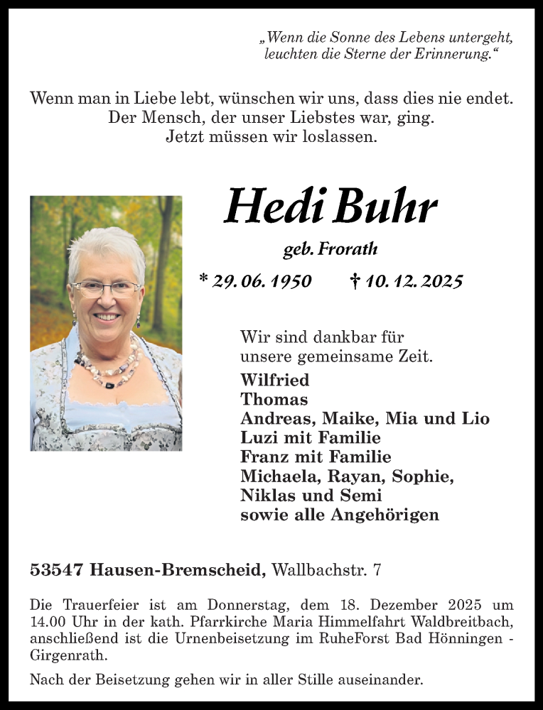 Hier finden Sie alle Traueranzeigen aus der Zeitung, die bisher für Hedi Buhr erschienen sind. Weitere Traueranzeigen, die in der Zeitung erscheinen, werden hier ebenfalls aufgelistet