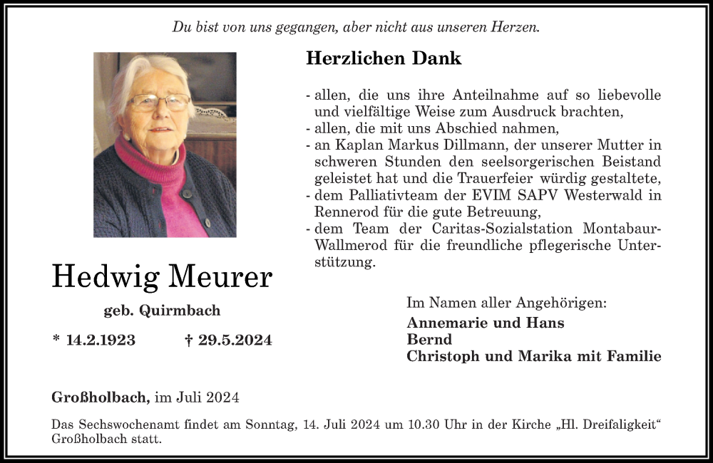 Hier finden Sie alle Traueranzeigen aus der Zeitung, die bisher für Hedwig Meurer erschienen sind. Weitere Traueranzeigen, die in der Zeitung erscheinen, werden hier ebenfalls aufgelistet