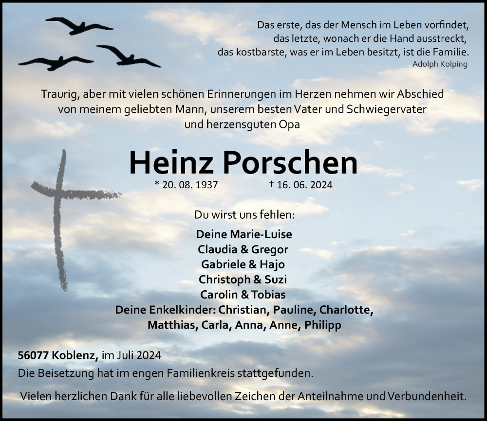 Hier finden Sie alle Traueranzeigen aus der Zeitung, die bisher für Heinz Porschen erschienen sind. Weitere Traueranzeigen, die in der Zeitung erscheinen, werden hier ebenfalls aufgelistet