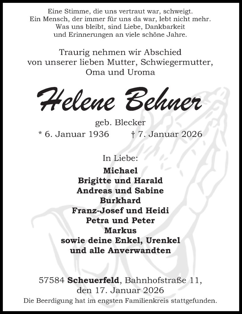 Hier finden Sie alle Traueranzeigen aus der Zeitung, die bisher für Helene Behner erschienen sind. Weitere Traueranzeigen, die in der Zeitung erscheinen, werden hier ebenfalls aufgelistet