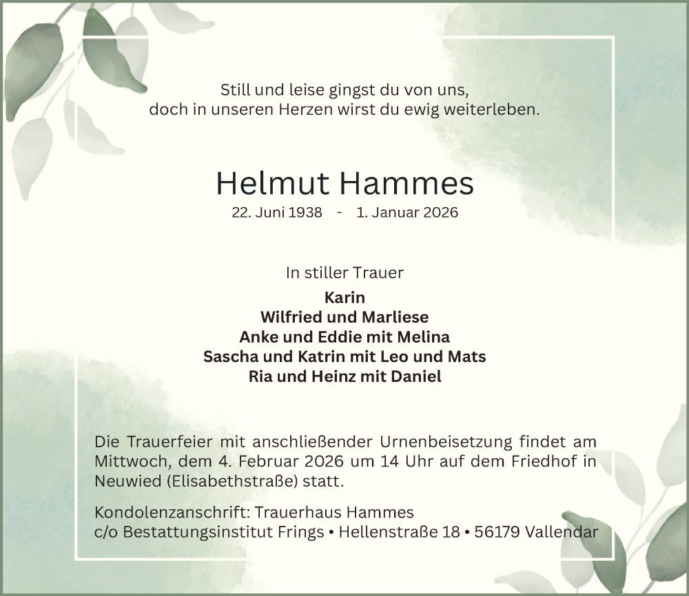 Hier finden Sie alle Traueranzeigen aus der Zeitung, die bisher für Helmut Hammes erschienen sind. Weitere Traueranzeigen, die in der Zeitung erscheinen, werden hier ebenfalls aufgelistet