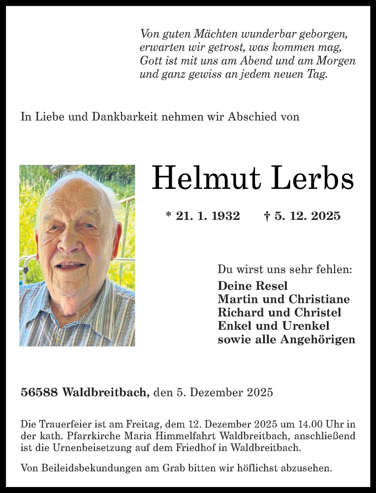 Hier finden Sie alle Traueranzeigen aus der Zeitung, die bisher für Helmut Lerbs erschienen sind. Weitere Traueranzeigen, die in der Zeitung erscheinen, werden hier ebenfalls aufgelistet