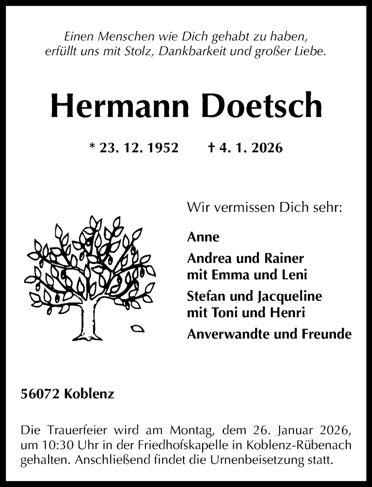 Hier finden Sie alle Traueranzeigen aus der Zeitung, die bisher für Hermann Doetsch erschienen sind. Weitere Traueranzeigen, die in der Zeitung erscheinen, werden hier ebenfalls aufgelistet