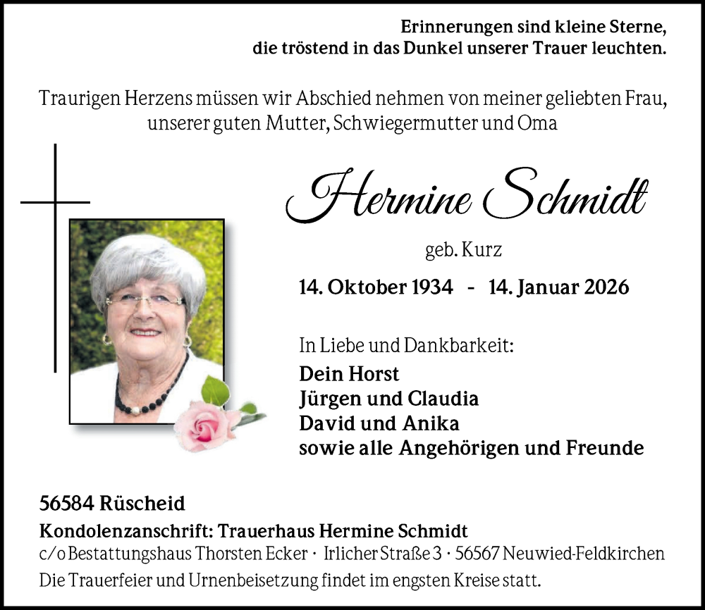 Hier finden Sie alle Traueranzeigen aus der Zeitung, die bisher für Hermine Schmidt erschienen sind. Weitere Traueranzeigen, die in der Zeitung erscheinen, werden hier ebenfalls aufgelistet