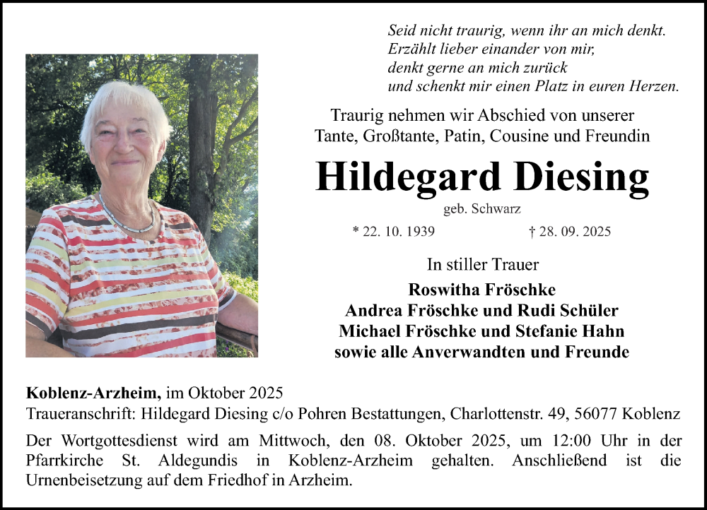 Hier finden Sie alle Traueranzeigen aus der Zeitung, die bisher für Hildegard Diesing erschienen sind. Weitere Traueranzeigen, die in der Zeitung erscheinen, werden hier ebenfalls aufgelistet