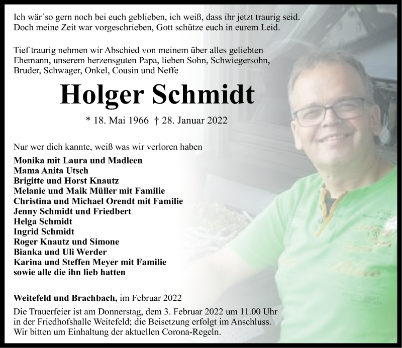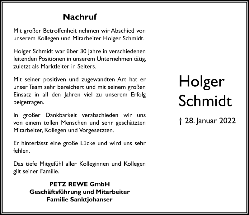 Hier finden Sie alle Traueranzeigen aus der Zeitung, die bisher für Holger Schmidt erschienen sind. Weitere Traueranzeigen, die in der Zeitung erscheinen, werden hier ebenfalls aufgelistet