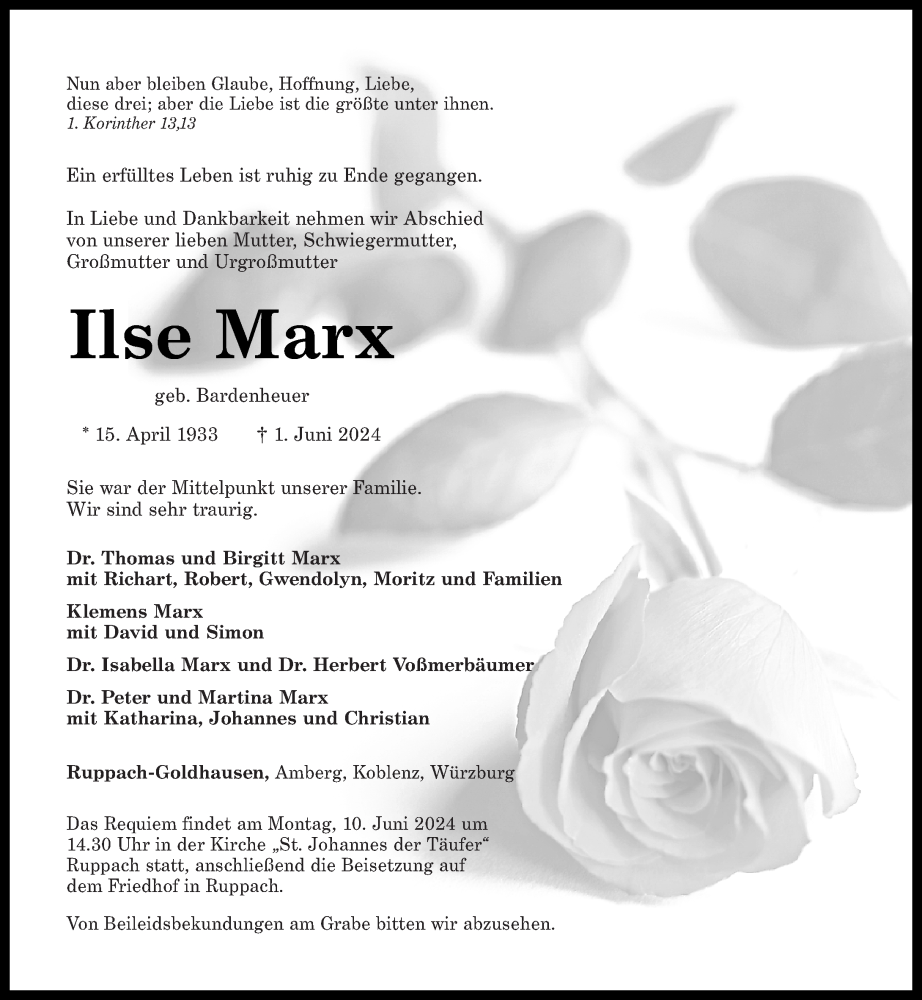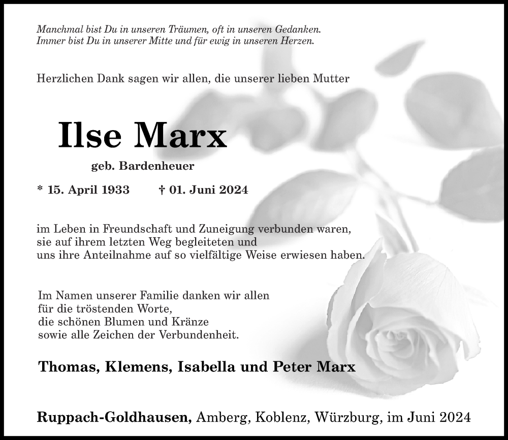 Hier finden Sie alle Traueranzeigen aus der Zeitung, die bisher für Ilse Marx erschienen sind. Weitere Traueranzeigen, die in der Zeitung erscheinen, werden hier ebenfalls aufgelistet