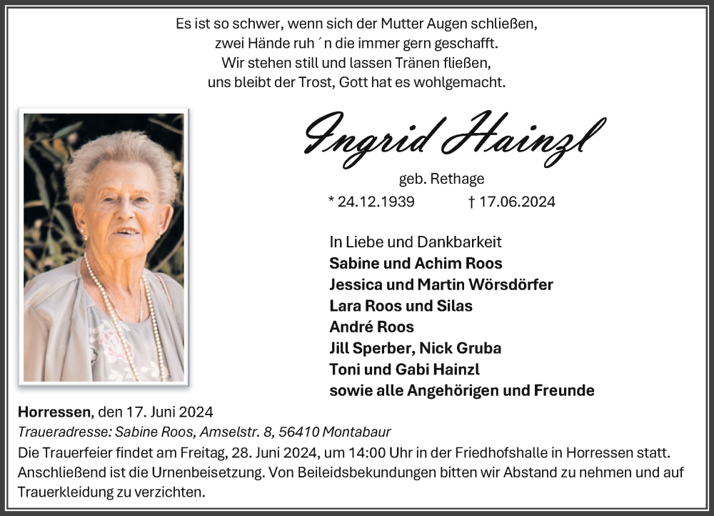 Hier finden Sie alle Traueranzeigen aus der Zeitung, die bisher für Ingrid Hainzl erschienen sind. Weitere Traueranzeigen, die in der Zeitung erscheinen, werden hier ebenfalls aufgelistet