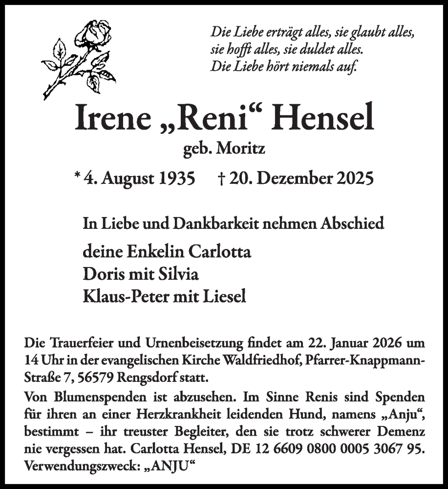Hier finden Sie alle Traueranzeigen aus der Zeitung, die bisher für Irene Hensel erschienen sind. Weitere Traueranzeigen, die in der Zeitung erscheinen, werden hier ebenfalls aufgelistet