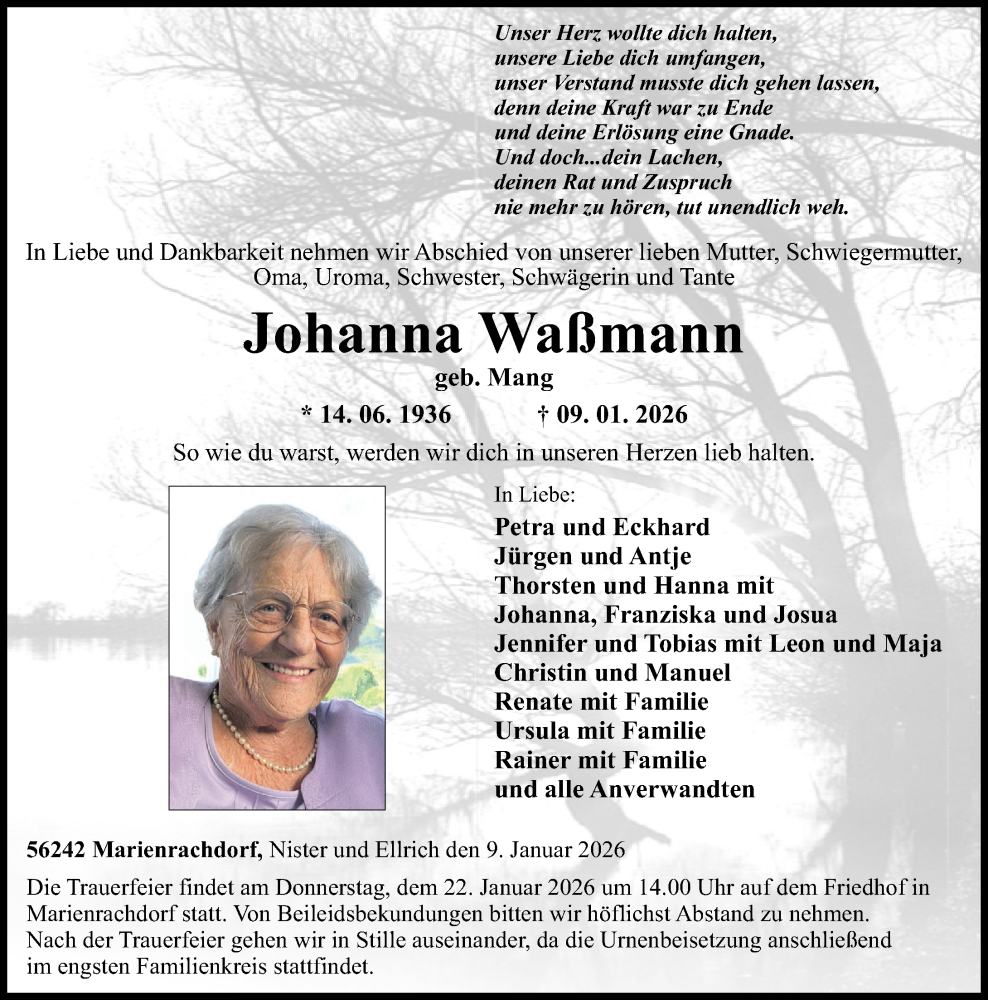 Hier finden Sie alle Traueranzeigen aus der Zeitung, die bisher für Johanna Waßmann erschienen sind. Weitere Traueranzeigen, die in der Zeitung erscheinen, werden hier ebenfalls aufgelistet