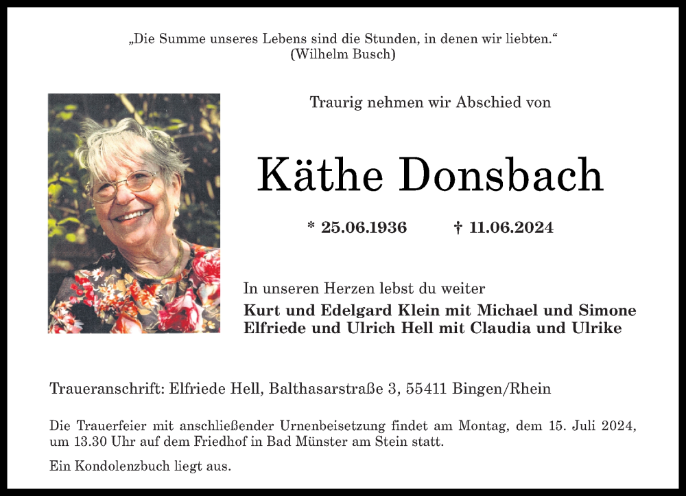 Hier finden Sie alle Traueranzeigen aus der Zeitung, die bisher für Käthe Donsbach erschienen sind. Weitere Traueranzeigen, die in der Zeitung erscheinen, werden hier ebenfalls aufgelistet