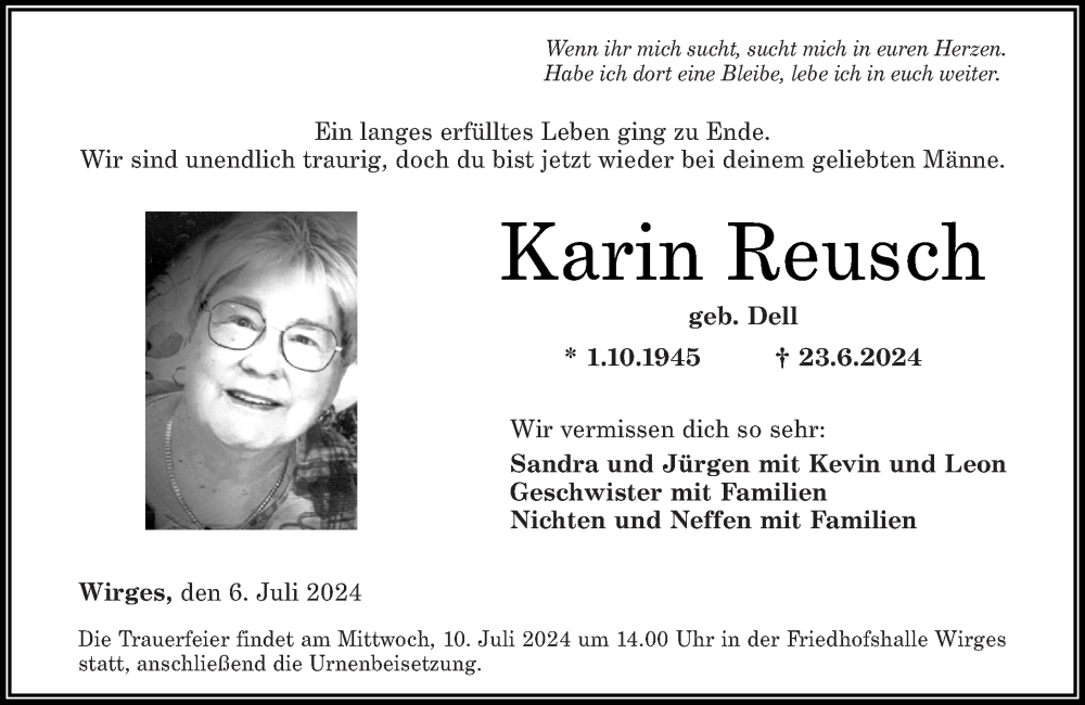 Hier finden Sie alle Traueranzeigen aus der Zeitung, die bisher für Karin Reusch erschienen sind. Weitere Traueranzeigen, die in der Zeitung erscheinen, werden hier ebenfalls aufgelistet