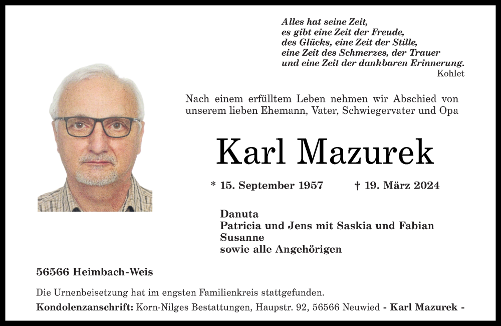 Hier finden Sie alle Traueranzeigen aus der Zeitung, die bisher für Karl Mazurek erschienen sind. Weitere Traueranzeigen, die in der Zeitung erscheinen, werden hier ebenfalls aufgelistet