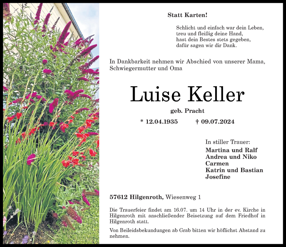 Hier finden Sie alle Traueranzeigen aus der Zeitung, die bisher für Luise Keller erschienen sind. Weitere Traueranzeigen, die in der Zeitung erscheinen, werden hier ebenfalls aufgelistet