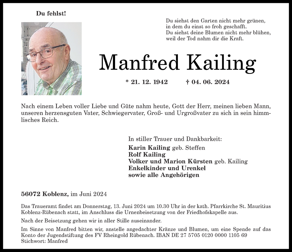 Hier finden Sie alle Traueranzeigen aus der Zeitung, die bisher für Manfred Kailing erschienen sind. Weitere Traueranzeigen, die in der Zeitung erscheinen, werden hier ebenfalls aufgelistet