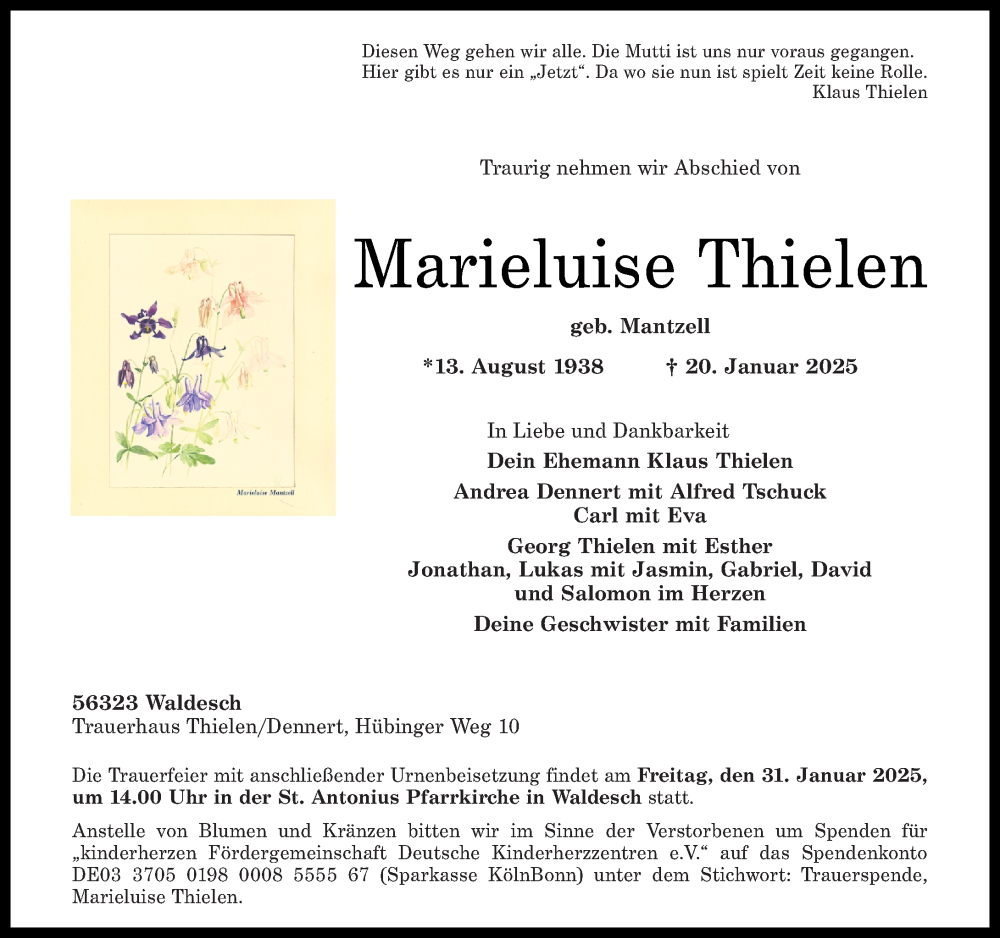 Hier finden Sie alle Traueranzeigen aus der Zeitung, die bisher für Marieluise Thielen erschienen sind. Weitere Traueranzeigen, die in der Zeitung erscheinen, werden hier ebenfalls aufgelistet