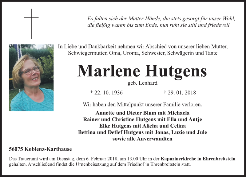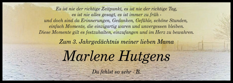 Hier finden Sie alle Traueranzeigen aus der Zeitung, die bisher für Marlene Hutgens erschienen sind. Weitere Traueranzeigen, die in der Zeitung erscheinen, werden hier ebenfalls aufgelistet
