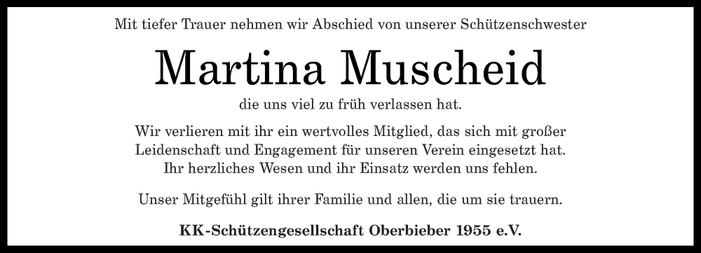 Hier finden Sie alle Traueranzeigen aus der Zeitung, die bisher für Martina Muscheid erschienen sind. Weitere Traueranzeigen, die in der Zeitung erscheinen, werden hier ebenfalls aufgelistet