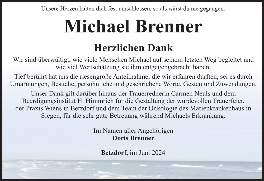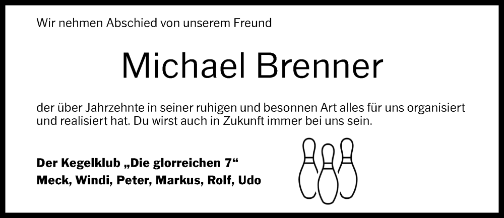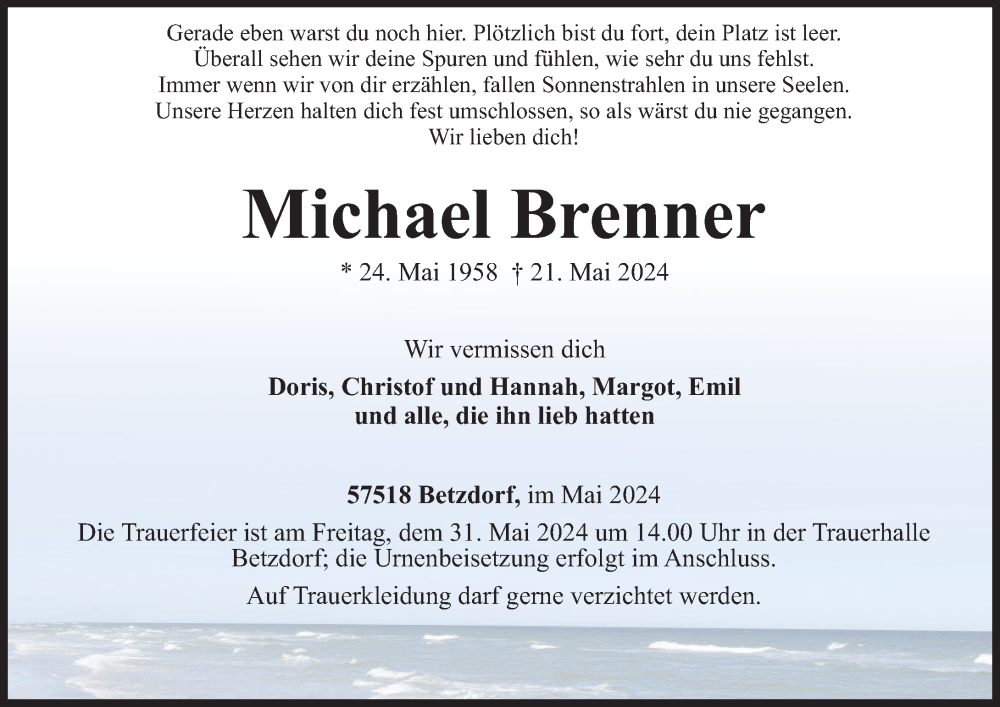 Hier finden Sie alle Traueranzeigen aus der Zeitung, die bisher für Michael Brenner erschienen sind. Weitere Traueranzeigen, die in der Zeitung erscheinen, werden hier ebenfalls aufgelistet