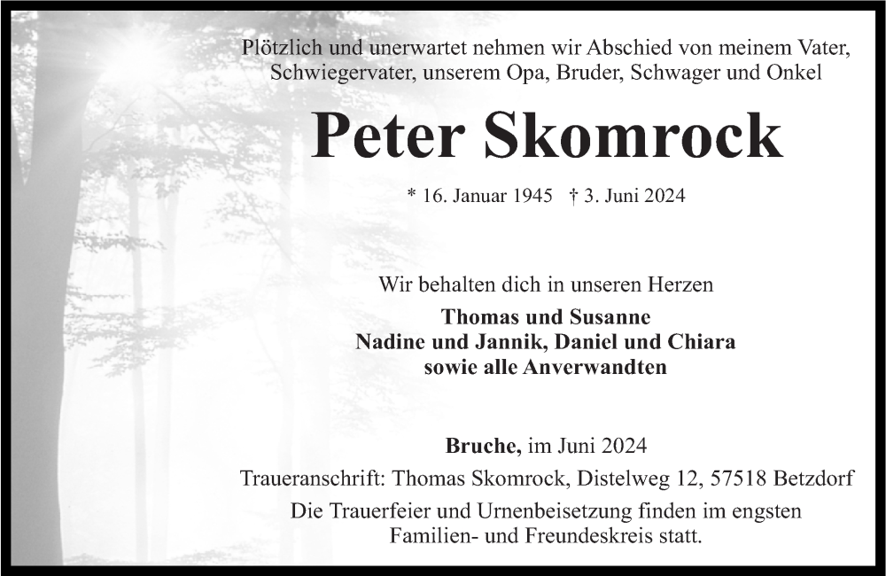 Hier finden Sie alle Traueranzeigen aus der Zeitung, die bisher für Peter Skomrock erschienen sind. Weitere Traueranzeigen, die in der Zeitung erscheinen, werden hier ebenfalls aufgelistet
