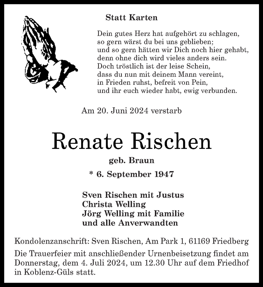 Hier finden Sie alle Traueranzeigen aus der Zeitung, die bisher für Renate Rischen erschienen sind. Weitere Traueranzeigen, die in der Zeitung erscheinen, werden hier ebenfalls aufgelistet