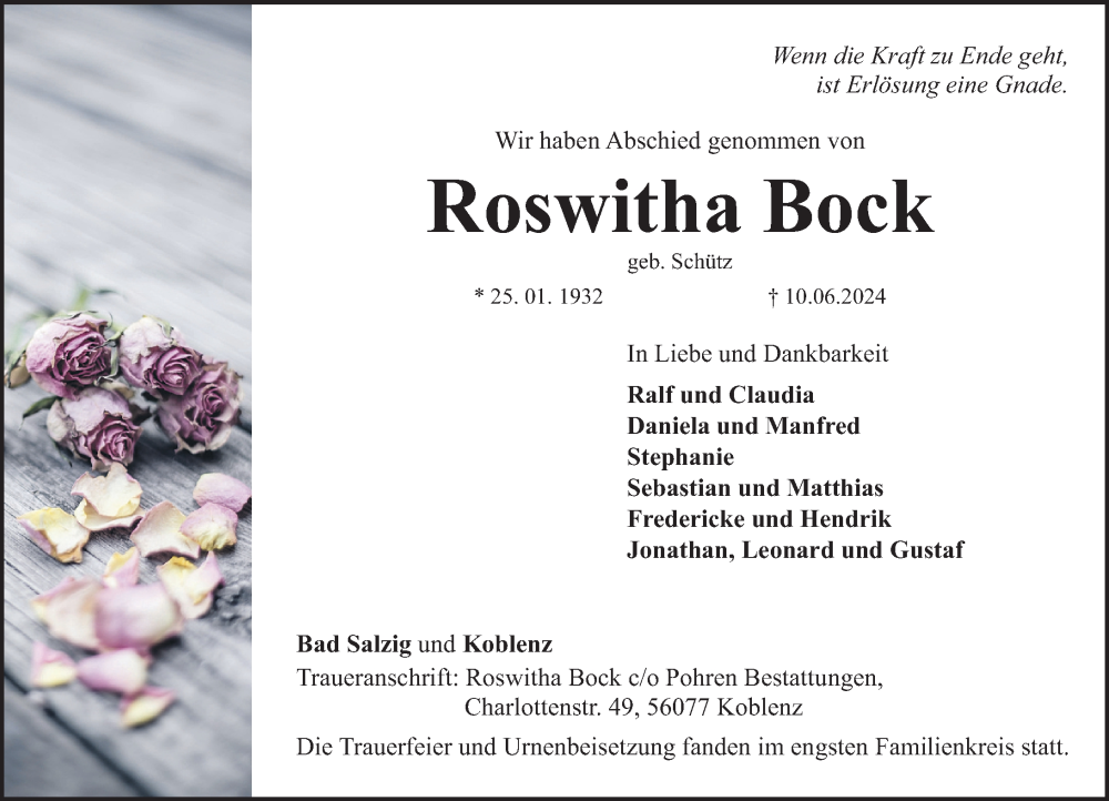 Hier finden Sie alle Traueranzeigen aus der Zeitung, die bisher für Roswitha Bock erschienen sind. Weitere Traueranzeigen, die in der Zeitung erscheinen, werden hier ebenfalls aufgelistet
