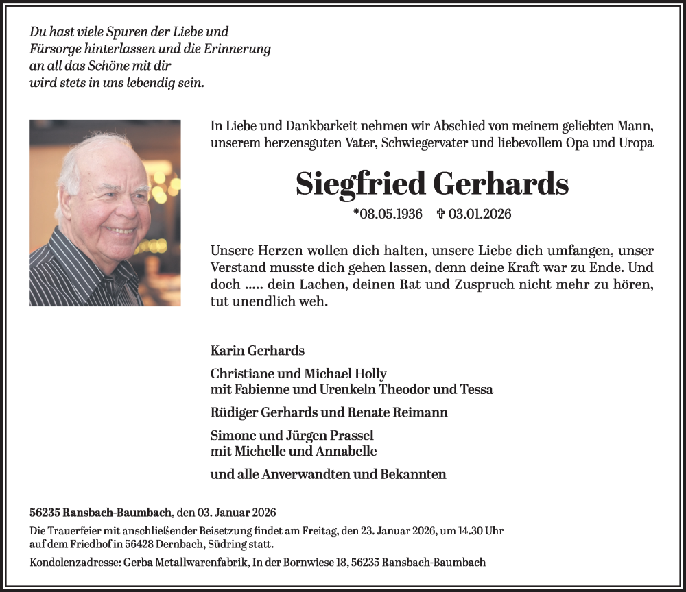 Hier finden Sie alle Traueranzeigen aus der Zeitung, die bisher für Siegfried Gerhards erschienen sind. Weitere Traueranzeigen, die in der Zeitung erscheinen, werden hier ebenfalls aufgelistet