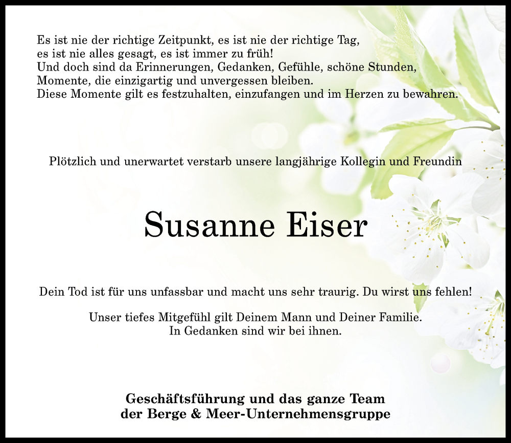 Hier finden Sie alle Traueranzeigen aus der Zeitung, die bisher für Susanne Eiser erschienen sind. Weitere Traueranzeigen, die in der Zeitung erscheinen, werden hier ebenfalls aufgelistet