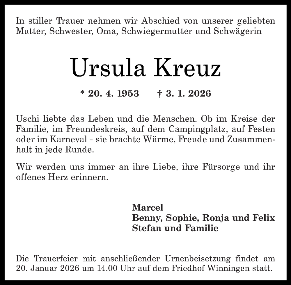 Hier finden Sie alle Traueranzeigen aus der Zeitung, die bisher für Ursula Kreuz erschienen sind. Weitere Traueranzeigen, die in der Zeitung erscheinen, werden hier ebenfalls aufgelistet