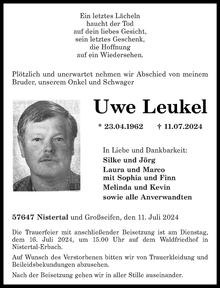 Hier finden Sie alle Traueranzeigen aus der Zeitung, die bisher für Uwe Leukel erschienen sind. Weitere Traueranzeigen, die in der Zeitung erscheinen, werden hier ebenfalls aufgelistet