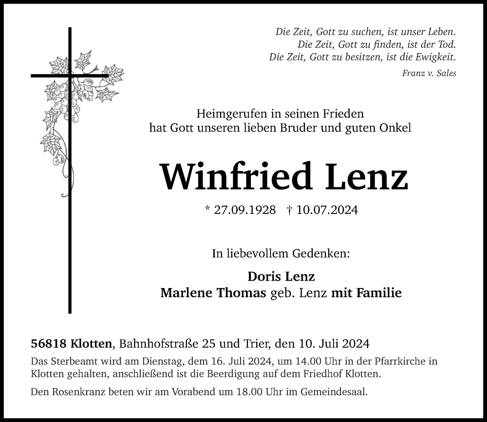 Hier finden Sie alle Traueranzeigen aus der Zeitung, die bisher für Winfried Lenz erschienen sind. Weitere Traueranzeigen, die in der Zeitung erscheinen, werden hier ebenfalls aufgelistet