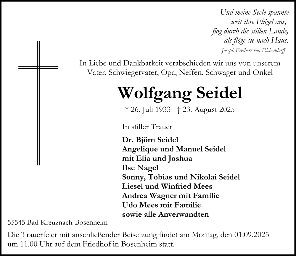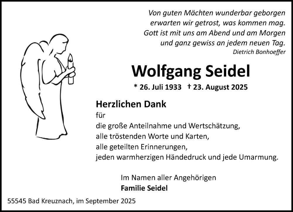 Hier finden Sie alle Traueranzeigen aus der Zeitung, die bisher für Wolfgang Seidel erschienen sind. Weitere Traueranzeigen, die in der Zeitung erscheinen, werden hier ebenfalls aufgelistet
